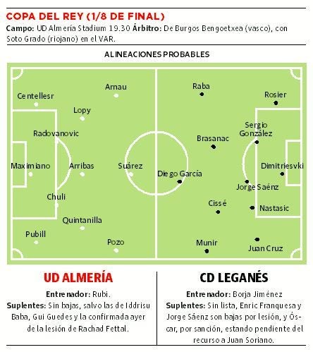 El Leganés llega avisado porque el equipo indálico se ha mostrado con idéntica contundencia en Liga y Copa, un proceso que se entremezcla y permite avanzar con solidez. Lo hace sin fisuras, con un comportamiento ejercido por un once base, pero que admite variables. Hoy las puede haber. Cierto es que Rubi maneja los tiempos y no se equivoca, utilizando siempre a los hombres exactos, bien para atemperar al rival en el inicio, bien para incentivar el control del partido o tratar de revertir una situación no resuelta, al final.