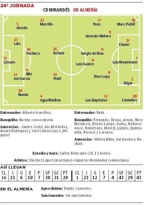 De todas formas, aquel Almería difiere un tanto del actual. Aquel concedía más en defensa que el actual. Aquel encajaba más de un gol por jornada y el de ahora concede bastante menos, lo que supone un motivo de esperanza en lo que a ser sólido y equilibrado se refiere.