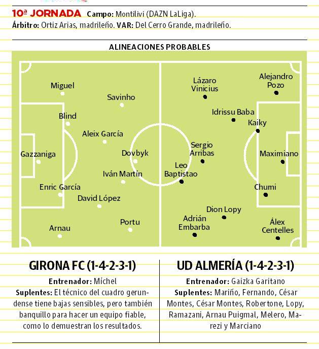 Todo apunta, como queda dicho, con un centro del campo con la presencia de Idrissu Baba y Dion Lopy, que sólo ha participado esta última semana a las órdenes del técnico deriotarra y pese a que Lucas Robertone está restablecido de la lesión sufrida frente al Valencia y que le impidió estar en los últimos tres partidos. Recuperado, podría tener 'chance' para participar, aunque lo mismo en la posición de enganche, lo que significaría romper los planes del técnico que ha utilizado a Sergio Arribas en esa posición, con Lázaro Vinicius y Adrián Embarba en los costados, con Leo Baptistao como hombre en punta para cerrar el dibujo típico que el entrenador del conjunto indálico ha utilizado en sus anteriores equipos. También Largie Ramazani ha dado muestras de capacidad para jugar de inicio, 'jugándose' el puesto con Lázaro Vinicius. También es cierto que Gaizka Garitano hizo cosas por repetir en la UDA como la de cerrar subidas con un lateral adelantado. En el Athletic llegó a utilizar a De Marcos por delante del lateral diestro. Arnau Puigmal podría hacer esa labor como rojiblanco en Montilivi.