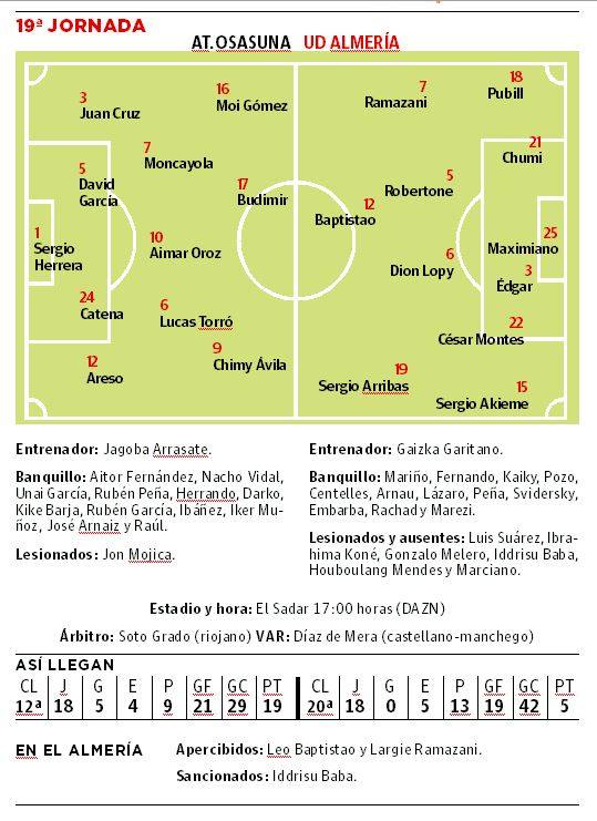 Para los rojillos, el Almería es el enemigo perfecto para conseguir tres puntos que le alejen más si cabe de la zona de descenso, de la que, con 19 puntos en su haber, puede poner más colchón de puntos. Además, Arrasate sólo tiene la baja de Mojica, que sigue recuperándose de la lesión sufrida en el ligamento lateral interno de la pierna derecha de modo que se espera un once muy reconocible con las dudas del lateral derecho, puesto al que optan Areso y Peña, Catena debería volver al once en un seguimiento lógico de los acontecimientos y Moncayola debe de acabar de asentarse junto a Aimar y Torró en la línea de medios para una cita en la que la UDA no quiere acabar atragantado.