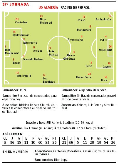 López Toca 'toca' otra vez: El cántabro José Antonio López Toca será, por segunda jornada seguida, el 'ojo avizor' en el VAR, en un partido de la UD Almería. En esta ocasión, en el decimoctavo a arbitrar por Lax Franco esta temporada, tras seis victorias locales, cinco visitantes y seis empates. Lleva mostrada la media de 5,41 tarjetas amarillas, sacado tres rojas y ha señalado penalti, acabado en gol, en seis jugadas.