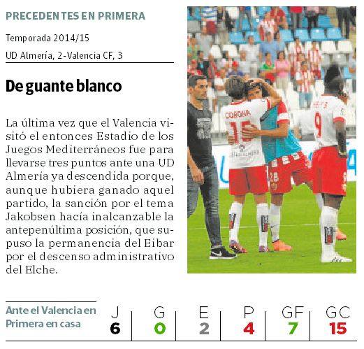 Por fortuna, las aguas bajan algo más tranquilas por Almería que por Valencia, pero la victoria es necesaria porque hay mucho en juego, como queda dicho. No han cambiado las cosas al respecto de cuando indálicos y valencianistas se enfrentaron en Metalla, en la decimoséptima jornada, un partido que seguramente no será referencia porque ambos equipos acudieron a esa cita con bajas, como ahora le ocurre a los de Rubi, pero con 'víctimas' diferentes. El técnico indálico, que cuenta con la recuperación de Iñigo Eguaras, tiene a cinco jugadores al borde de la suspensión –Ely, Chumi, Samú Costa, Arnau y Ramazani– y son bajas El Bilal Touré y Akieme, aunque pendientes de si Dyego Sousa se recuperaba porque ayer estuvo en su segundo entrenamiento de la semana.