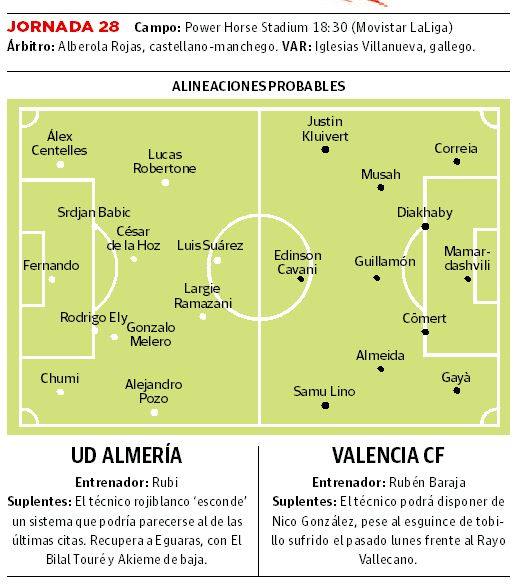 El Valencia duda sobre si Nico González podría jugar o no, teniendo en cuenta que ante el Rayo acabó tocado. Además, Samu Lino podría aparecer por el costado izquierdo en lugar de Samu Castillejo, siendo Justin Kluivert el otro atacante, al costado de Edinson Cavani. También Baraja llega con muchos apercibidos, pero no es momento de 'reservar' nada. Con Mamardashvili, ante el que Ramazani falló una pena máxima, se antoja una defensa con Thierry Correia y Gayà por los costados, con Diakhaby y Cömert, por el centro. Con Musah, Guillamón y Almeida, en la sala de máquinas, buscando que, aunque las cicatrices se vean, sanen, aunque su rendimiento lejos de Mestalla deja tanto que desear como el de la UDA. El cuadro valencianista nunca logró mantener su puerta a cero y, en siete de los 13 partidos que ha jugado como visitante, en más de la mitad –siete– se quedó sin celebrar nada, aunque nadie duda de que nunca da su brazo a torcer. Qué menos.
