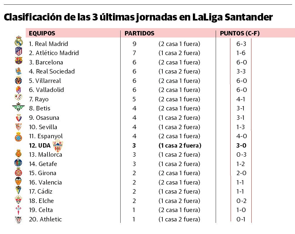 Barcelona, Villarreal y Real Valladolid han ganado sus dos choques en casa, sin puntuar a domicilio. Como también se han quedado sin puntuar lejos de su feudo equipos como Espanyol, la propia UDA, Girona o Celta de Vigo, que es el próximo rival del conjunto almeriense (sábado, 14.00 horas).