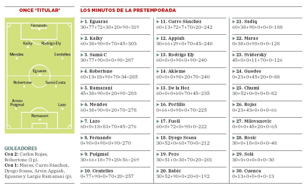 Además, la pretemporada ha demostrado que Kaiky Fernandes ha llegado para hacerse con un hueco en los planes de Rubi desde el primer momento. Por su calidad y, en parte, por el hecho de que Rubi no podrá contar para la primera jornada con Rodrigo Ely ni Babic, ambos sancionados con un partido por acumulación de amonestaciones, tras la amarilla que vieron en Leganés.