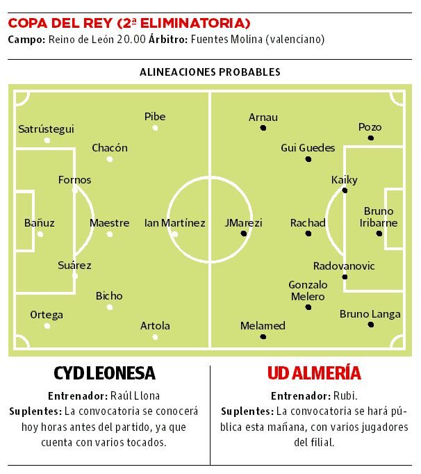 El equipo indálico busca una más ante la Cultural y Deportiva Leonesa que está de subidón y busca dar la sorpresaYa se sabe cómo es la Copa del Rey de traicionera en el que el factor campo suele jugar en favor del más débil, además ... de que éste, crecido, tiene equipo para pelear por el triunfo. La UD Almería visita hoy el Estadio Reino de León con la mosca tras la oreja, pese a ser tal vez el equipo más en forma de Segunda División, pero su enfrentamiento de esta noche, desde las 20.00 horas, se escenifica ante un rival que casi es de la categoría de plata. La Cultural y Deportiva Leonesa lidera el grupo primero de Primera Federación con mano de hierro, aunque ha demostrado ser más sólido a domicilio que en su recinto de juego, donde acumula las dos únicas derrotas sufridas en las quince primeras jornadas del campeonato liguero.