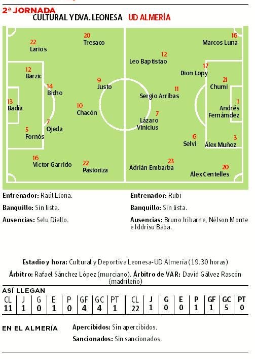 La Cultural y Deportiva Leonesa, que inicia esta jornada como colista después de un duro 5-1 en El Plantío de Burgos –donde comenzó jugando en inferioridad desde el segundo 40, casi en el mismo momento en el que la UDA encajaba el primer gol del campeonato–, espera su oportunidad para sacudirse el polvo del estreno y recordar que en su estadio siempre hay espacio para las sorpresas. No será un encuentro cualquiera. El Reino de León guarda memorias encontradas con el equipo almeriense como aquella primera visita con empate que, con el tiempo, fue clave para la salvación rojiblanca por el golaveraje particular al cierre de la 2017/18, cuando ambos empataron a puntos y sólo uno logró permanecer en Segunda División. Ni tampoco se olvida el último capítulo, cuando en la Copa del Rey del curso pasado la eliminatoria se tiñó de rojiblanco con una victoria visitante que confirmó que, en el fútbol, la historia nunca deja de repetirse de formas distintas. También el resultado llegó tras sufrir.
