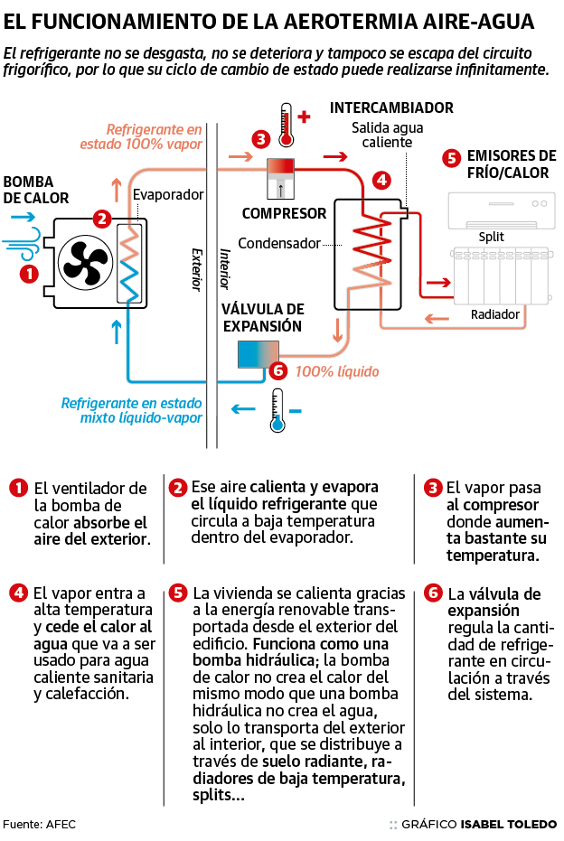La aerotermia es la calefacción de moda. Este sistema de climatización, que utiliza bombas de calor y sirve tanto para calentar una vivienda en invierno ... como para enfriarla en verano, es el más eficiente desde el punto de vista energético, ya que por cada kilowatio hora que consume aporta cuatro de calor. En el caso, por ejemplo, de una vivienda unifamiliar de unos 100 metros cuadrados ubicada en una comunidad con un clima similar al de Madrid, con un aislamiento térmico medio y una temperatura de confort de 22 grados, la diferencia de precio entre la aerotermia (574 euros) y el gas natural (976 euros) es de unos 400 euros al año y de casi 2.000 si la caldera es eléctrica (2.570 euros)», según los datos del estudio realizado por Selectra en el que se compara el consumo energético de los principales sistemas de calefacción.