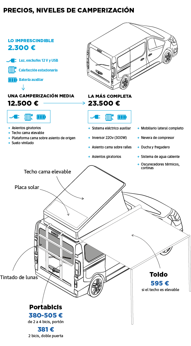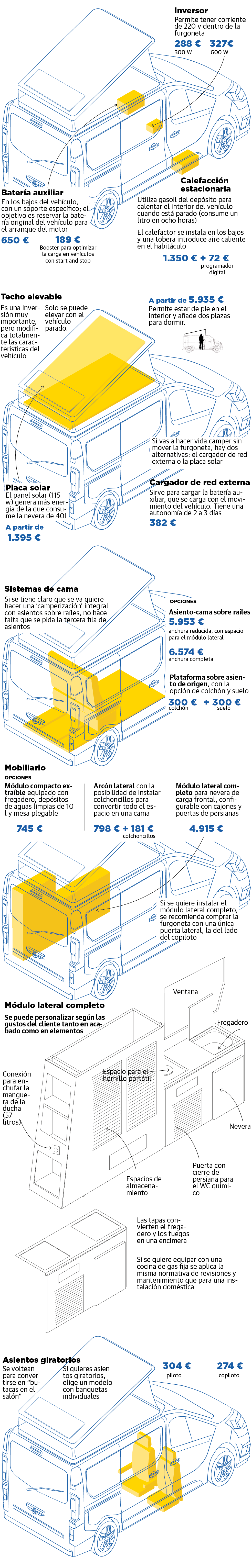 Los expertos aconsejan empezar por una batería auxiliar, enchufes y calefacción. Después se le puede añadir suelo, una plataforma con colchón, techo elevable... Eso sí, prepara el bolsillo. Disponer de todo el equipamiento de una autocaravana en un vehículo compacto supera los 20.000 euros