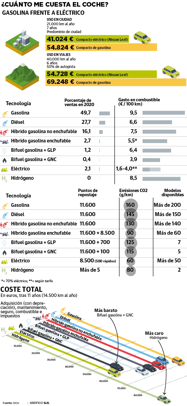Al margen de las evidentes ventajas medioambientales, otro de los motivos que empuja a los conductores a pasarse a la energía limpia, especialmente en las grandes ciudades, es la posibilidad de acceder al centro y aparcar sin ningún tipo de coste. «Cada uno tiene que valorar cuáles son sus necesidades reales de movilidad y a partir de ahí elegir el modelo de coche que más le convenga», aconseja Juan Luis Fernández. ¿Y si se compra uno de segunda mano? «En ese caso, el modelo eléctrico resulta todavía más interesante, mientras que el de gasolina sería la opción más cara», precisan los expertos.