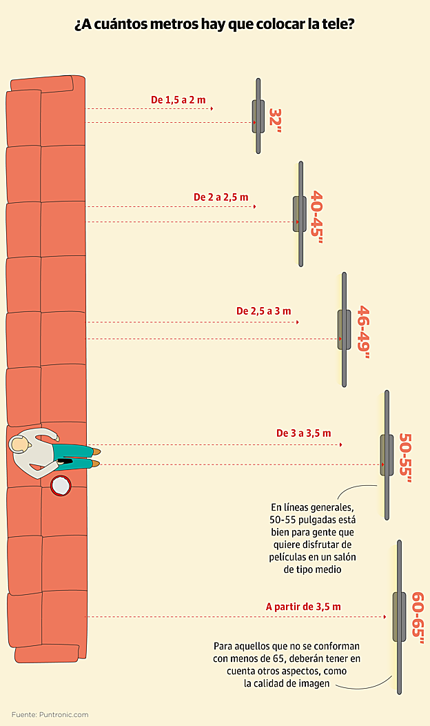 Es importante medir la distancia desde el punto central donde uno se sienta para ver la televisión hasta el lugar donde se va a instalar el aparato para calcular el tamaño de pantalla que mejor se adapta al espacio del que disponemos. Por ejemplo, no es recomendable colocar un televisor de más de 50 pulgadas (unos 110 centímetros de ancho) si la distancia a la pantalla es inferior a tres metros.