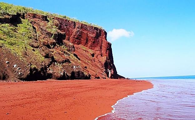 «Hay muy pocas playas de color rojo en el mundo», adelanta Franco. Se pueden encontrar en Hawai, Isla Rábida, Galápagos, Santorini (Grecia) y alguna en Asturias. En estos casos, la arena se compone principalmente de hierro. «Gracias a su singular geología, Hawai es la isla que más playas tiene con este color. Situada Maui, Kaihalulu Beach está escondida en una pequeña cala cerca de la bahía de Hana, en la mitad oriental de la isla. La arena obtiene su color rojo-negro por el desmoronamiento de la colina rica en hierro que rodea la bahía», añade el especialista.