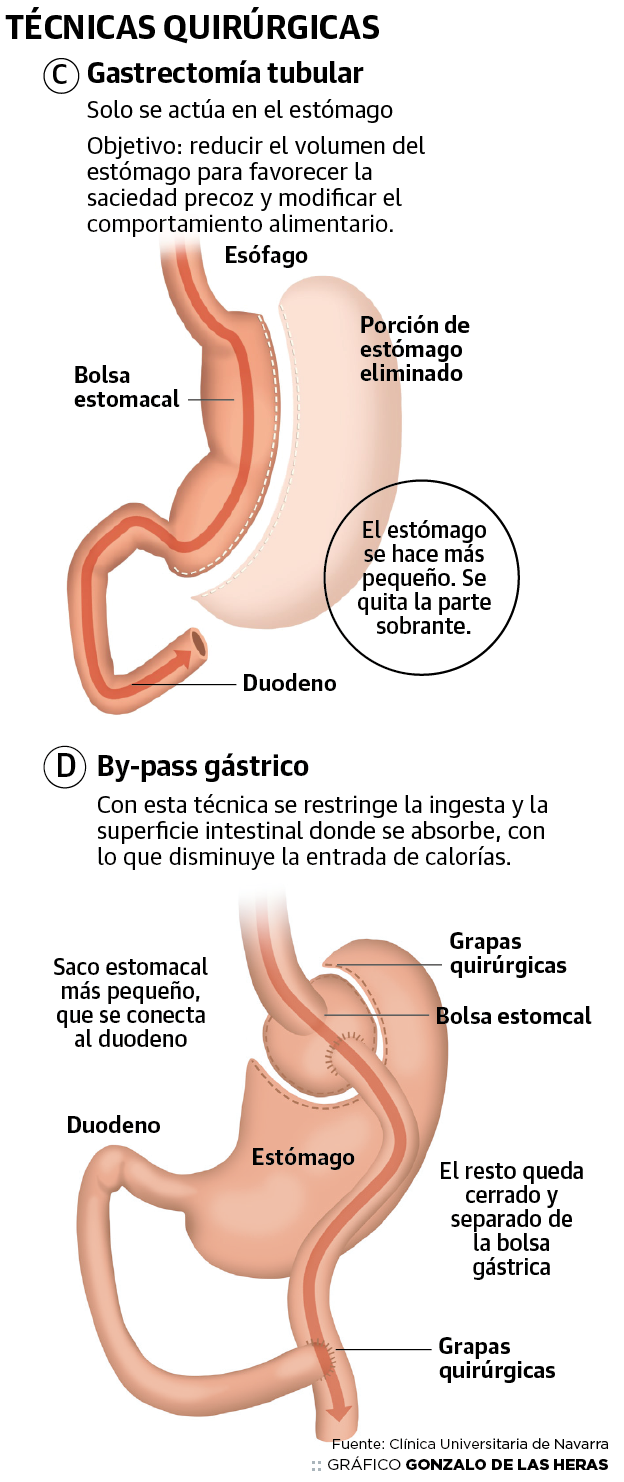 Sin embargo, el 90% de las intervenciones se practican mediante cirugía laparoscópica. Consiste en extirpar parte del estómago y anular una pequeña parte del tracto intestinal, mediante un 'bypass' gástrico. Existe, además, un tercer método, también mediante cirugía, que consiste en provocar un mayor número de saltos en el intestino para que la comida se absorba solo en los tramos que interesa. Su uso es muy reducido por sus mayores efectos secundarios y se reserva solo para casos de obesidad muy extrema.