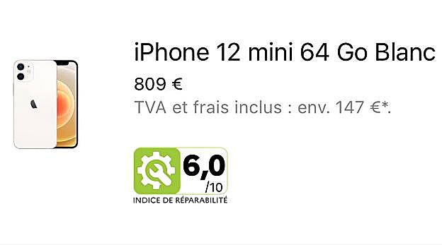 En el ejemplo bajo estas líneas observamos la mentada etiqueta respecto a un iPhone 12 mini de Apple. Su índice de reparabilidad es de 6 puntos sobre 10, lo que resulta de puntuar cada uno de los factores anteriormente enumerados y calcular la media aritmética. Hablamos en este caso de un smartphone difícil y costoso de reparar: haremos bien en optar por otro con una calificación superior si no queremos gastar mucho al cambiarle la pantalla (porque se haya roto) o la batería (por el desgaste natural tras numerosos ciclos de carga).