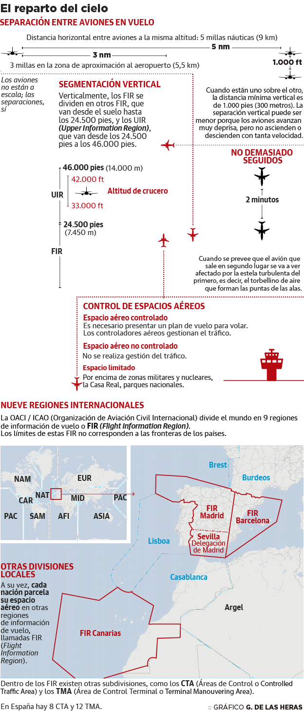 Lo primero a tener en cuenta es que el espacio aéreo, a nivel internacional, está dividido en nueve Regiones de Información de Vuelo o FIR ('Flight Information Region'), determinadas por la Organización de Aviación Civil Internacional (OACI), y que no corresponden exactamente a las fronteras de los países. España forma parte de la FIR europea (EUR). A su vez, estas están divididas en otras FIR más pequeñas. En España tenemos tres, la de Madrid, que recoge la delegación de Sevilla; la de Barcelona y la de Canarias. Verticalmente, las FIR se dividen en FIR y UIR ('Upper Information Region'). La primera ocupa la distancia que hay desde el suelo a los 24.500 pies (7,5 km) y la segunda va desde los 24.500 pies a los 46.000 pies (14 km). Es entre los 33.000 y los 42.000 pies donde los vuelos comerciales suelen alcanzar la 'altitud de crucero'. Allí, los aviones se enfrentan a una menor resistencia del aire, que es menos denso, y eso les hace consumir menos combustible y viajar más rápido.