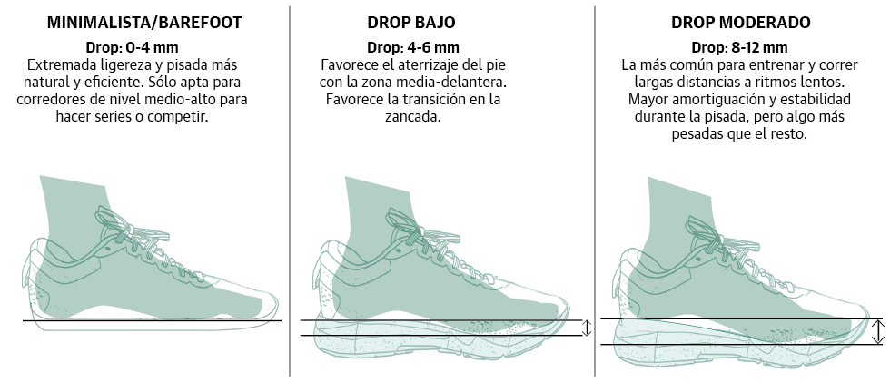 En ocasiones verás que las zapatillas para correr también se pueden clasificar según el 'drop' que tienen o, lo que es lo mismo, la diferencia que hay entra la altura del talón y la altura del antepie: