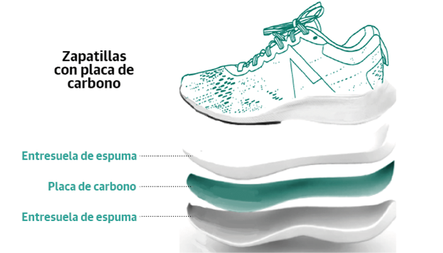Las zapatillas con las que el atleta keniano Eliud Kipchoge bajó en 2019 de las dos horas (1:59:40) en Viena, incorporan esa tecnología. Sin embargo, la World Athletics, el órgano de gobierno del atletismo a nivel mundial, las prohíbió oficialmente para competir. En la actualidad, la mayoría de las marcas tienen en su gama de competición placas de carbono que potencian la reactividad y que sí cumplen con la normativa.