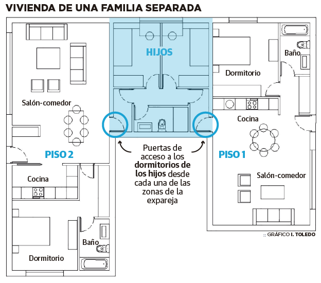 Más de 80.000 parejas se separaron en España en 2020, último registro del Instituto Nacional de Estadística. Al margen del impacto emocional, el económico. « ... Un divorcio supone un crack para el bolsillo de toda la familia porque si hay hijos hay que pasar a mantener dos viviendas»... ¿O no? Es la propuesta del arquitecto Javier Ruiz Barbarin, que ya trabaja en varios proyectos de remodelación para habilitar en una misma casa dos espacios independientes para los ex y un tercer hueco para los menores. «En Noruega, Holanda o Suecia ya hay promotoras que hacen pisos nuevos con tres unidades diferenciadas: un pisito con cocina, salón, baño y habitación para uno de los cónyuges, otro igual para el otro y un espacio común con baño y tantas habitaciones como hijos haya. En España es incipiente aún, pero llegará».