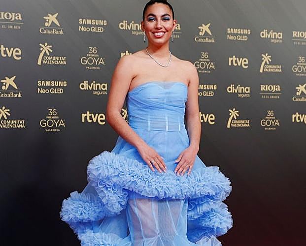 Ganadora al Goya por la canción de 'Mediterráneo', reforzó la muerte de inmigrantes en el mar con un vestido azul de enormes 'olas'. «Es excesivo, pero una alfombra roja es precisamente para eso y me gusta el mensaje», dice Bellón.