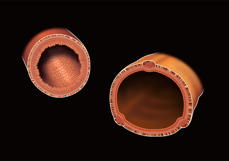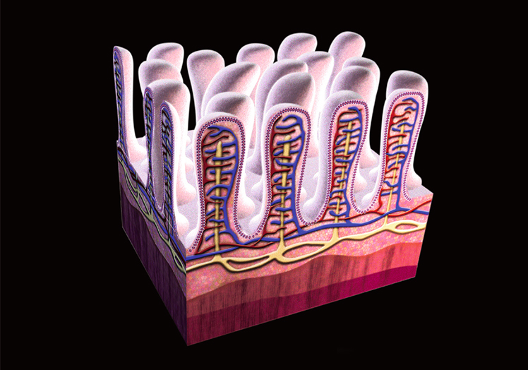 La pared interna del intestino delgado está revestida de millones de proyecciones llamadas ‘vellosidades’. Cada una está dotada de un vaso linfático y una red de vasos sanguíneos que la nutren. Cada vellosidad está cubierta por una capa celular que absorbe nutrientes. Junto con estas células epiteliales existen unas microvellosidades que optimizan la absorción de nutrientes.