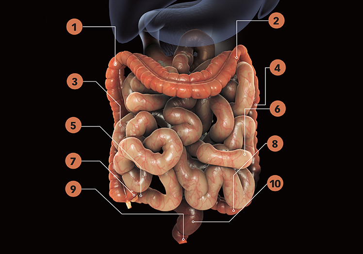 1. Colon ascendente: el agua y las sales minerales son absorbidas a lo largo del intestino grueso, en un proceso que deseca los restos alimentarios.