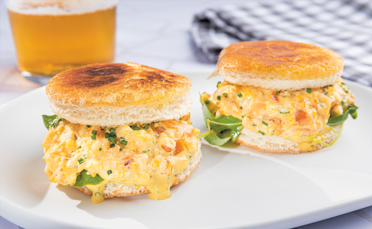 Del relleno: pica el bogavante y el salmón ahumado con un cuchillo. Mientras, en una sartén con una pizca de aceite, dora el salmón fresco por sus dos caras un minuto. Pícalo también y mezcla en un bol con el otro salmón y la carne de bogavante. Añade la cebolleta y el huevo, luego la mahonesa y mezcla. Rectifica de sal. Deja que el relleno enfríe bien y no quede suelto para rellenar mejor los panecillos. Ábrelos en dos y dóralos con mantequilla en una sartén por las dos caras. En un bol coloca las hojas de rúcula, vierte un chorrito de AOVE y sal y mezcla.