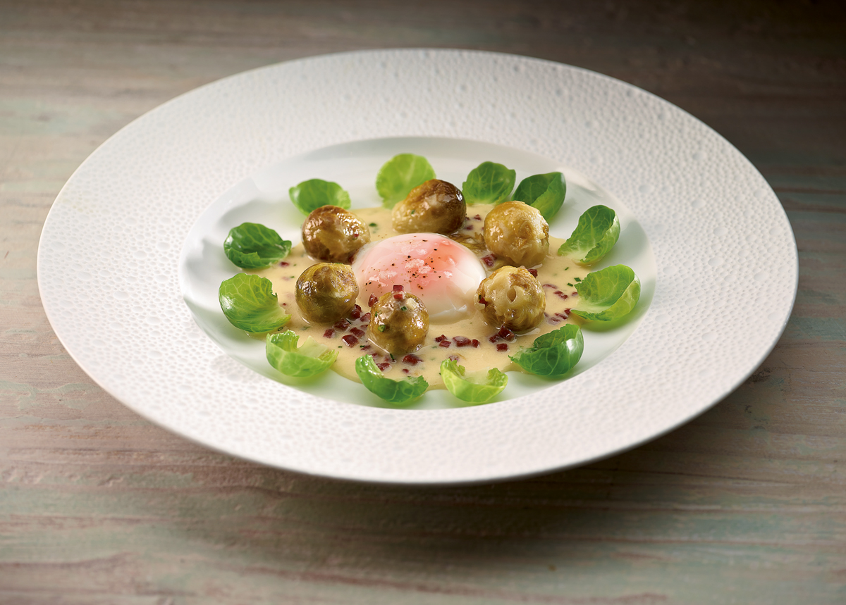 4. Acabado: al servir, se coloca el guiso de coles caliente en el centro. Se escurren los huevos, se cascan y colocan sobre la verdura, procurando no rasgar las yemas. Por último se da un calentón ligero a las hojas de col en el microondas y se aliñan con unas gotas de aceite de oliva y sal.