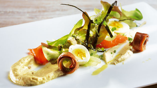 4. Sobre estas lechugas, las lonchas de salmón ahumado y las anchoas en salazón, se aliña el conjunto con la vinagreta previamente elaborada y, por encima, se colocan un poco del alga nori picada en juliana y los huevos de codorniz partidos por la mitad.