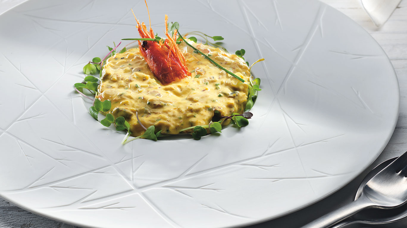 Acabado y presentación: en un bol agregamos la mayonesa fría, el huevo rallado y el cebollino picado. Ayudándonos con una lengua de mezclar, añadimos la gamba sin aplastar.