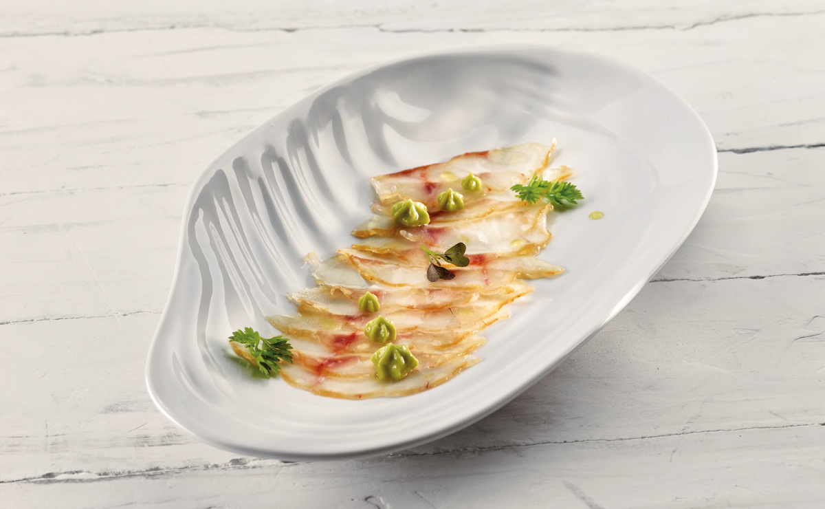 4. Colocamos las lonchas sobre un plato a modo de carpaccio. Pintamos el pescado con una pizca de aceite de oliva, colocamos unos puntos de crema de aguacate picante y rematamos con cebollino picado y brotes de cilantro.