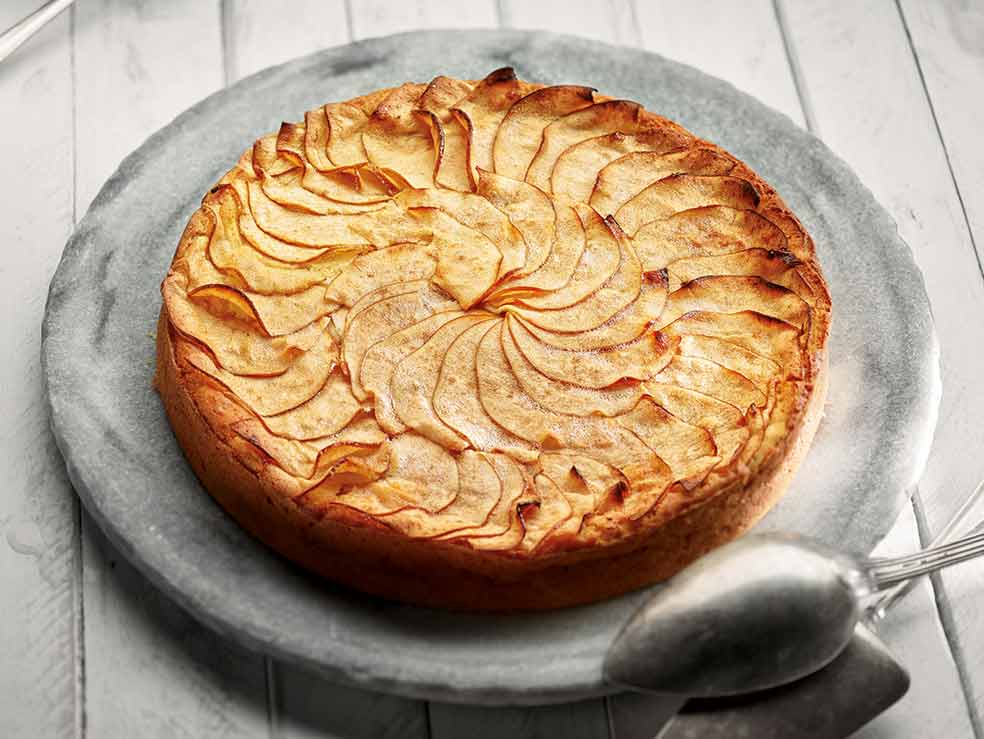Este bizcocho de manzana queda estupendo servido aún tibio y rociado con unas gotas de brandy o ron añejo, para que se empape la miga, y guarnecido con un buen helado de turrón.