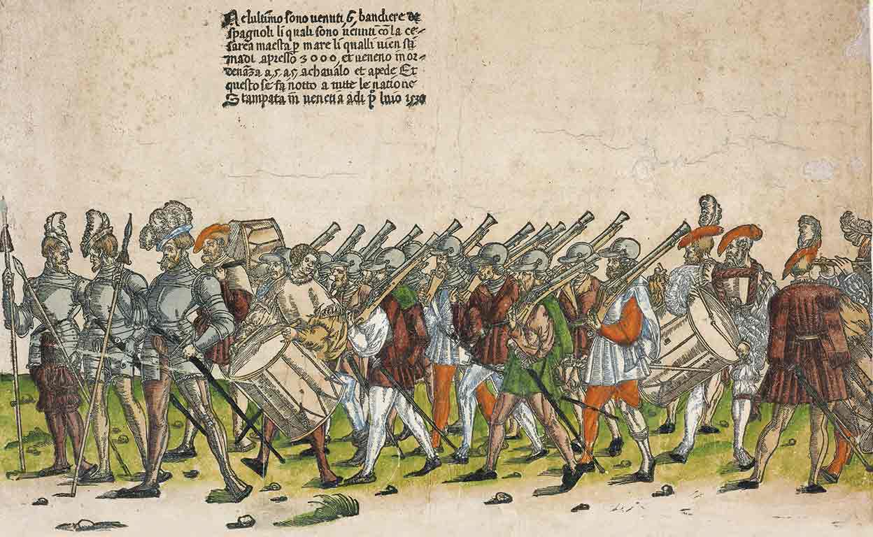 Grabado que muestra a los arcabuceros españoles con el aspecto que tenían en la batalla de Bicoca.
