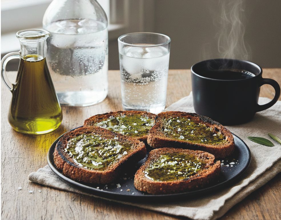 «Tostadas, me gustan mucho de pan de centeno, casi quemadas, con aceite de oliva virgen y sal. Un vaso de agua muy fría con hielo y luego un café solo».